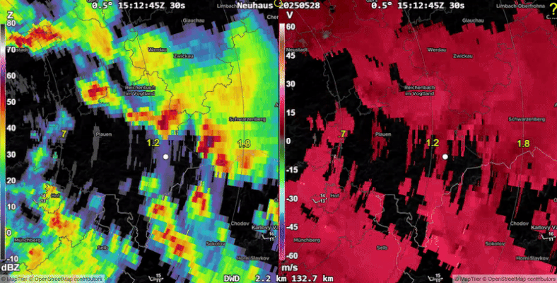 Am 28.05.2025 hatte sich über dem Atlantik ein recht glatte Westströmung eingestellt. Auf der Vorderseite in einer eher diffluenten und leicht zyklonal gekrümmten Höhentrömung. Der zunächst flache Trog konnte sich im Tagesverlauf amplifizieren und zog dabei bis zum Abend westwärts über Deutschland hinweg. Zum dem Höhentrog gehörte ein zunächst flaches Wellentief, dass sich im Laufe des Tages dem Antrieb aus der Höhe folgend ebenfalls intensivieren konnte. Seine Kaltfront kam am Nachmittag von Nordwesten kommend südostwärts bis zur Mitte voran.Im Vorfeld konnten sich in feuchtlabiler Luftmasse einige hundert J/kg bis 1000 J/kg an CAPE entwickeln. Gerade im südlichen Bereich der Labilitätsenergie gab es deutlich erhöhte Scherwerte sowohl hochreichend (0-6 km), als auch im unteren Troposphärenniveau (0-1 km). Die 0-1 km Scherung lag zwischen 10 und 15 m/s und die ebenso erhöhten SRH Werte zeigten das erhöhte Potential für rotierende Zellen und Tornados.
