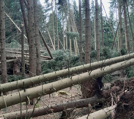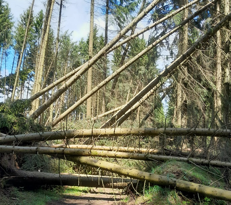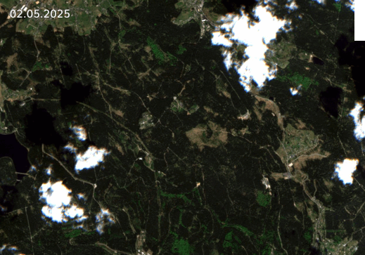 Der Tornado zog abschließend durch die bewaldeten Gebiete zwischen Hammerbrücke und Klingenthal. Dabei kam es zu teils flächigen Schäden im Fichtenbestand (s. Bild 4–7 - bis TSW, DoD 3: IF1). Die Schäden treten in kleinen, räumlich klar abgegrenzten Clustern auf, die meist deutlich unter 80 Meter breit sind und sich entlang der Schneise verteilen. Zwischen dem Mineralienzentrum Schneckenstein und dem «Floßgrabenweg» verläuft ein rund zwei Kilometer langer Bereich ohne im Satellitenbild erkennbare Schäden. Westlich des «Waldhotel Vogtland» (50.404, 12.475) setzt erneut eine durchgehende Schneise mit flächigen Schäden ein, die bis zu 130 Meter breit ist und direkt über das Hotelgelände führt (TSW, DoD 4: IF1.5 erscheint möglich, ist mangels Detailaufnahmen jedoch nicht gesichert). Über mögliche Sachschäden liegen derzeit keine Informationen vor. Die Schneise endet rund einen halben Kilometer westlich der B283 in Klingenthal.