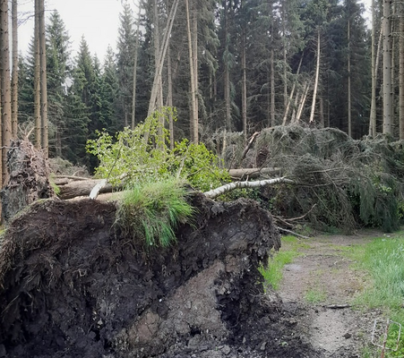 Gegen 18:30 MESZ zog eine rotierende Gewitterzelle über den betreffenden Bereich. Ein Augenzeuge berichtet von einer deutlich erkennbaren Drehbewegung der Wolken. In deren Verlauf entstand eine etwa 6,6 Kilometer lange und bis zu 130 Meter breite Schneise mit teils flächigen Forstschäden, beginnend in Hammerbrücke und endend südlich von Mühlleithen. Die ersten bekannten Auswirkungen entstanden östlich der «Muldengerger Straße» (50.430, 12.414) in Hammerbrücke, wo Birken entwurzelt und Baumkronen von Fichten abgebrochenen wurden (TRW, DoD 3: IF0.5 - nördliche Fallrichtung - s. Bild 1-3).