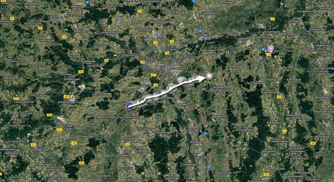 Der Tornado bildete sich vermutlich im Süden von Erbach, wo die ersten Schäden dokumentiert werden konnten. Unweit nördlich der Donau, zwischen der «Donauallee» und der Straße «Großes Wert» (48.323, 9.901), stürzte zunächst eine Esche um (s. Bild 1 - TRW, DoD 3: IF0.5). Im angrenzenden Kleingartenareal (48.323, 9.903) wurde ein Pflaumenbaum entwurzelt (s. Bild 2). Die sich zunehmend konkreter abzeichnende Schneise setzt sich über die Fischerteiche nördlich der Donau (48.327, 9.922) fort, wo in den dortigen Baumreihen deutlich abgegrenzte Schäden auf wenigen Metern Breite entstanden (s. Bild 3 - TSW, DoD 2: IF1).
