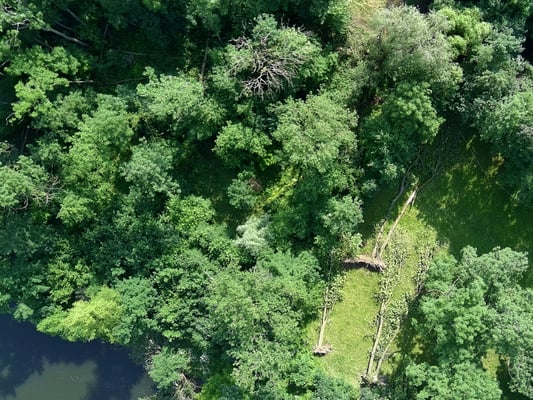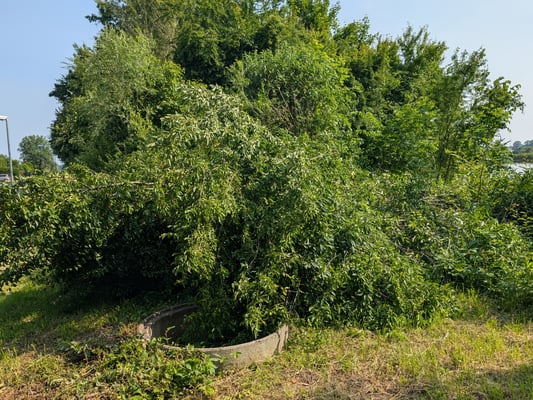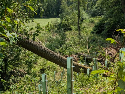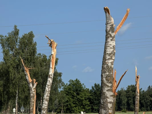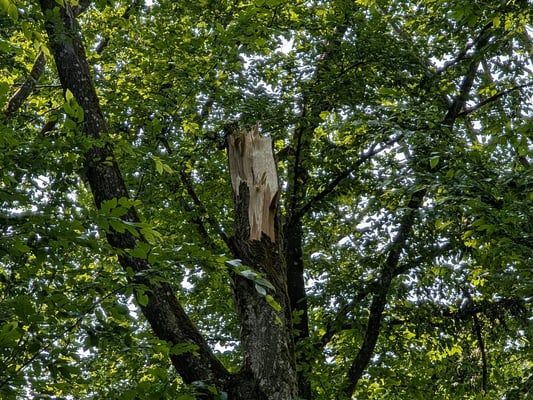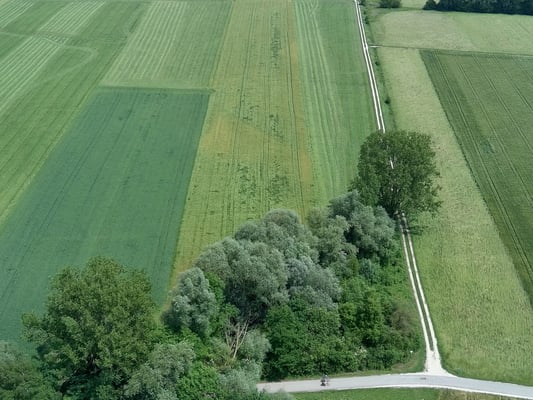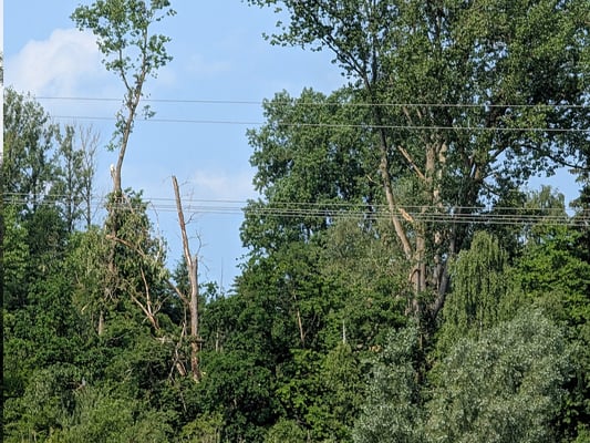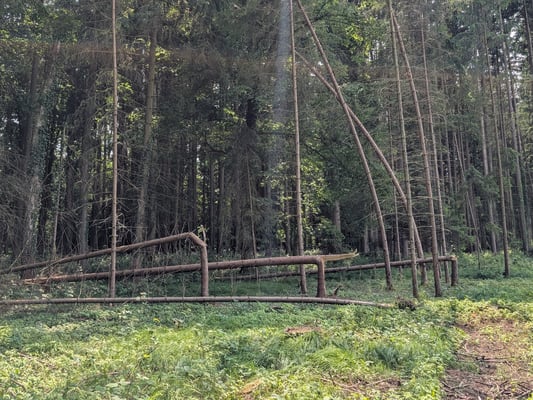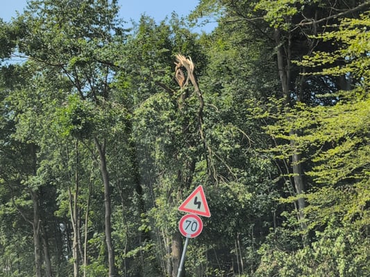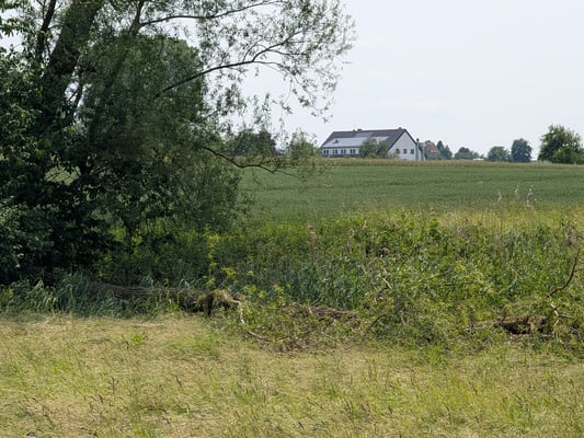 Nach Überquerung der Iller und eines dichten Waldgebiets, das im Rahmen der Vor-Ort-Dokumentation nicht näher untersucht werden konnte, verursachte der Tornado südlich von Ludwigsfeld eine durchgehende Schneise mit Vegetationsschäden. Diese begann spätestens an der B28 (48.352, 10.012), wo eine Espe entwurzelt wurde und zahlreiche Äste abbrachen (s. Bild 18 - TRW, DoD 3: IF0.5), und setzte sich über die «Memminger Straße» (48.355, 10.016) hinweg fort (s. Bild 19 - TSW, DoD 1: IF0.5). Östlich des Wotzen Sees (48.356, 10.022) zeigt sich sich, unmittelbar an Vegetationsschäden anschließend (entwurzelte Esche, abgeknickte Äste, konvergente Fallrichtungen - TSW, DoD 1: IF0.5), eine weitere Feldspur, die jedoch nicht so klar ausgeprägt ist wie die vorherigen (s. Bild 20).