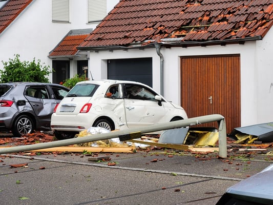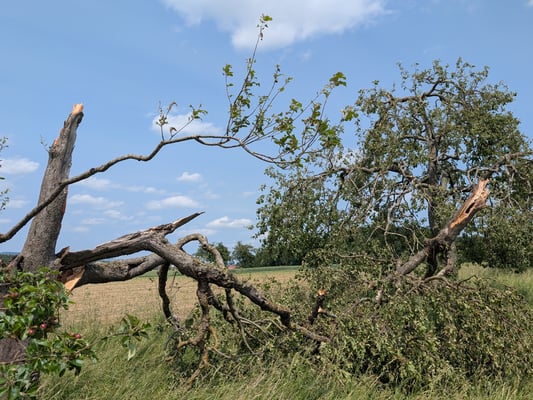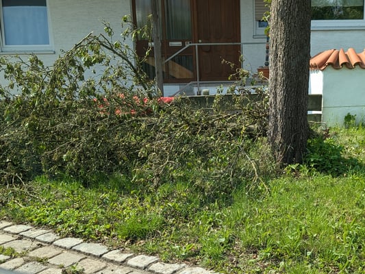 Unmittelbar nach dem Passieren der Landstraße verengt sich die Schneise schlagartig, und die Feldspur verliert sich zunehmend. Der Tornado überquerte anschließend die Donau und entwurzelte in einem schmalen Abschnitt am «Kreutwiesenbach» (48.329, 9.929) mehrere Bäume (s. Bild 7 – TSW, DoD 1: IF0.5). Sobald der Tornado in den bebauten Bereich von Donaustetten eintrat, verliert sich die zuvor durchgehende Schneise. Stattdessen lassen sich diskrete, aufeinanderfolgende Schadensabschnitte erkennen. Dieses Muster zeigt sich ausschließlich im Ortsbereich, was die Vermutung nahelegt, dass die dichte Bebauung Einfluss auf die Integrität des Bodenwirbels genommen haben könnte. Einer dieser Schadensabschnitte befindet sich entlang der «Alb-Donau-Straße» (48.330, 9.932), wo ein Garten verwüstet und Äste abgebrochen wurden (s. Bild 8, Schäden teilweise bereits beseitigt - TSA, DoD 2: IF1). Ein Video zeigt die deutlich rotierende Mesozyklone über Donaustetten, unterhalb derer die Schäden im Ort entstanden sind (s. Video 1). Aufgenommen wurde das Video in Unterweiler mit Blickrichtung Westnordwest.