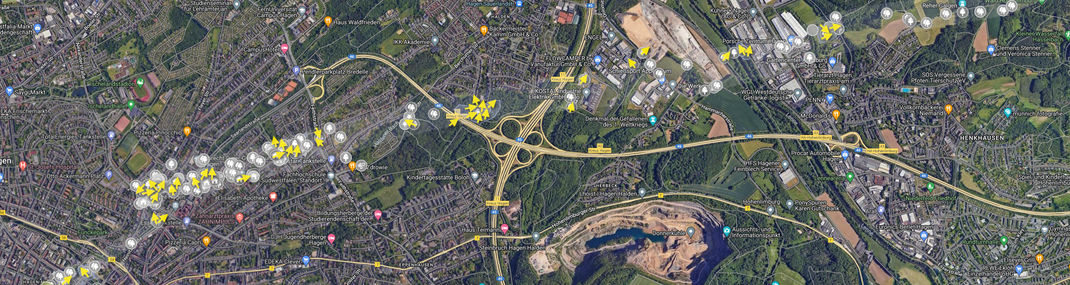 (Übersicht zur Tornadoschneise in Hagen | Gelbe Pfeile = Wirkungsrichtungen im Bereich)