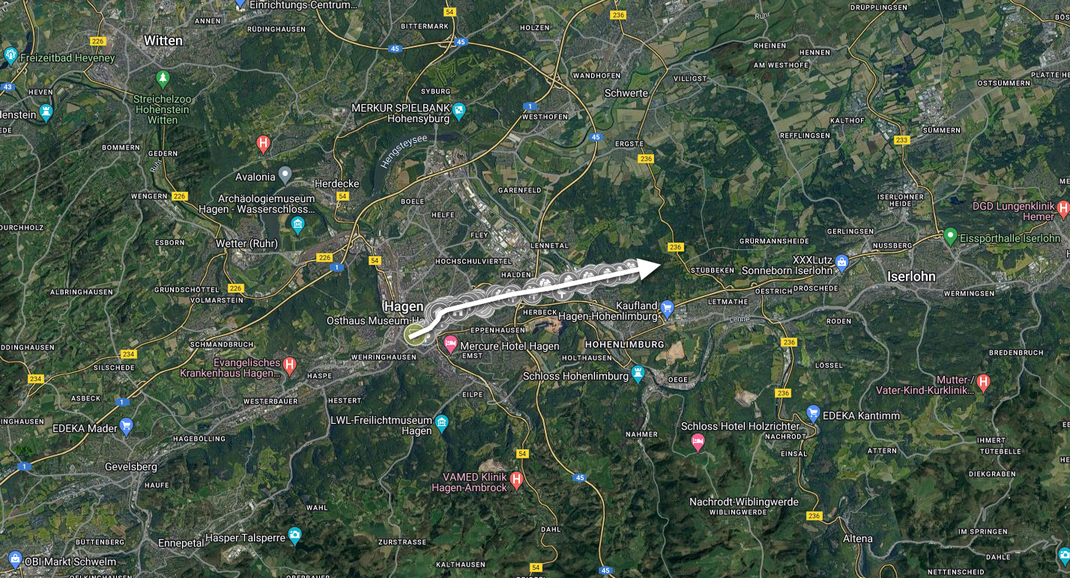Der Tornado zog nördlich am Autobahnkreuz Hagen vorbei und erreichte schließlich das Industriegebiet an der A45, wo südlich der Straße »Lange Eck« (51.371, 7.522) einige Bäume entwurzelt und Äste abgeknickt wurden (s. Bild 33-34 - TSA, DoD 1: IF1). Eine Dashcam zeichnete den Tornado im Bereich der darauffolgenden »Dolomitstraße« (51.373, 7.530), an der es zu Vegetationsschäden kam (TRA, DoD 1: IF0.5), auf. Erkennbar ist ein Windrichtungswechsel einhergehend mit dem Überzug des Tornados (s. Video 1). An den darauffolgenden Zugschienen und an der Lenne entwurzelte der Tornado in einem schmalen Bereich viele Bäume und brach (mittel-)große Äste ab (s. Bild 35-36 - TSA, DoD 2: IF1).