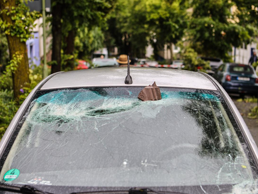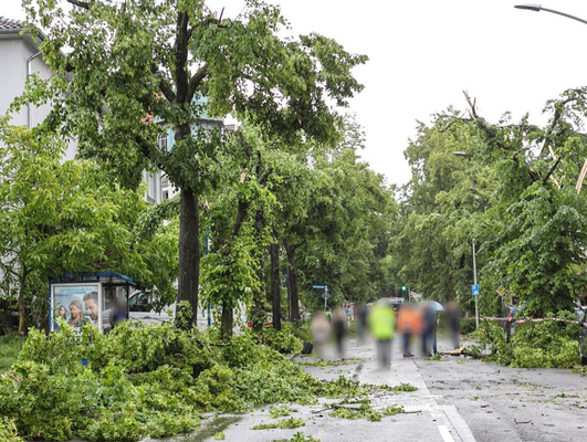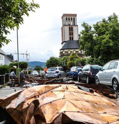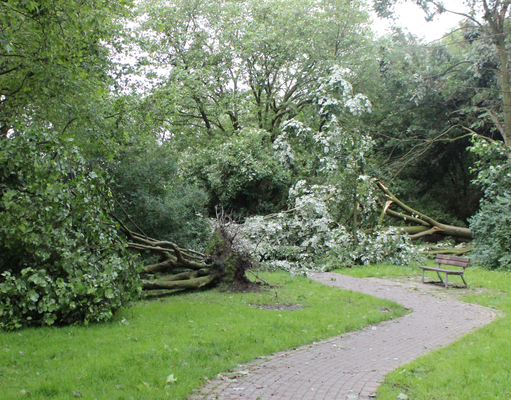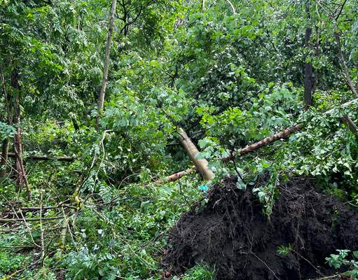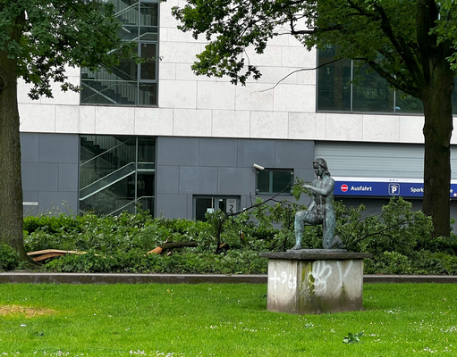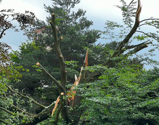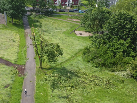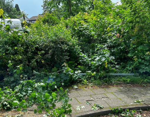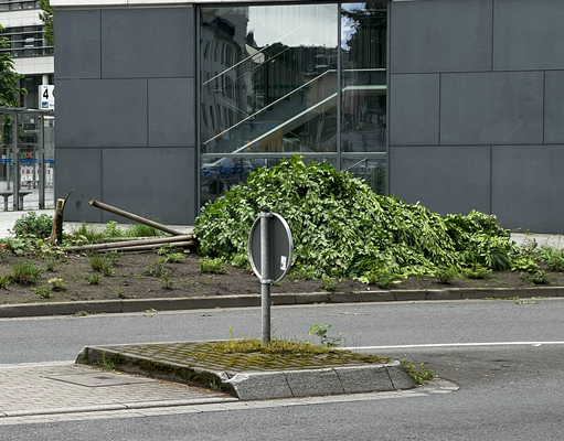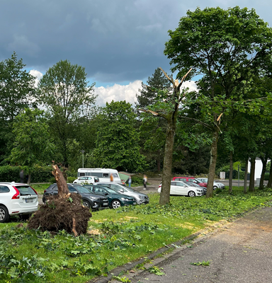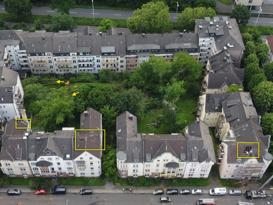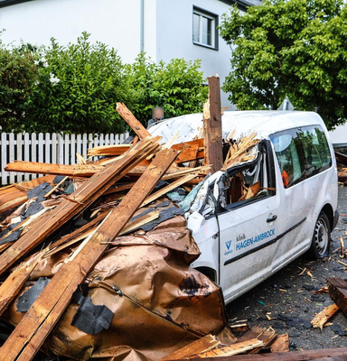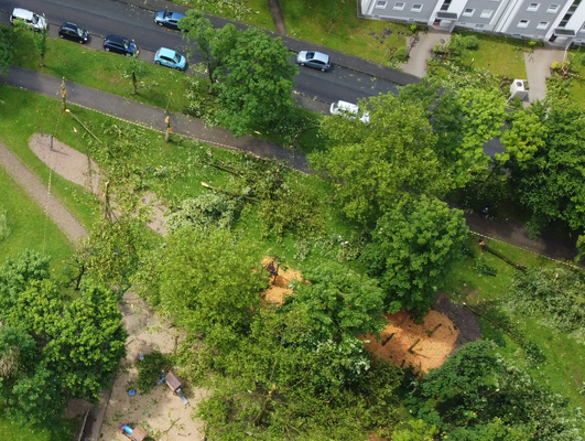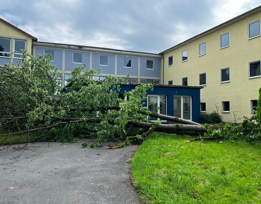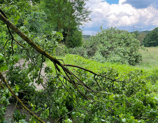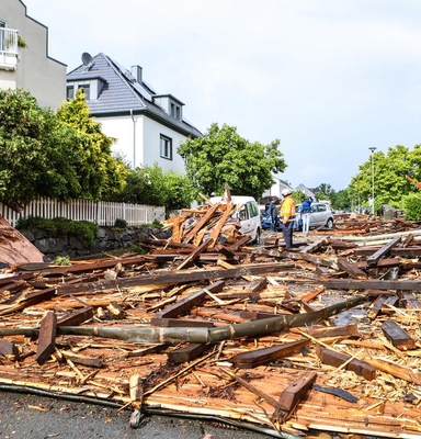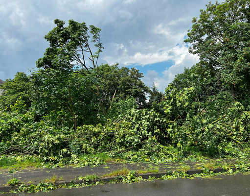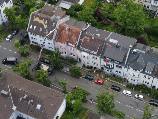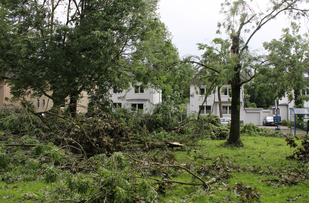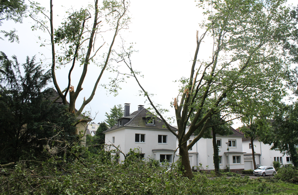 Ähnliche Schäden ziehen sich durch die folgende »Aschenbergstraße« (51.366, 7.480), in der vor allem mittelgroße bis große Äste abgeknickt und Autos beschädigt wurden (s. Bild 8-9). In der »Karls-Halle-Straße« (51.366, 7.481) deckte der Tornado einige Dächer teilwiese ab (BNTS, DoD 1: IF1) und brachte im Innenhof große Bäume zu Fall (in nördliche Richtung, rechtswinklig zum Schneisenverlauf - s. Bild 10).