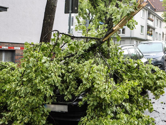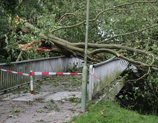 Es folgt die besonders schwer betroffene »Fleyer Straße«, in der auf ~ 150 Metern Länge zahlreiche Dächer von Reihenhäusern teilabgedeckt (s. Bild 5 - BNTS, DoD 1: IF1) und viele Bäume beschädigt wurden (s. Bild 6-7 - TRA, DoD 2: IF1). Parkende Autos wurden durch herabfallende Äste und Ziegel beschädigt; Vereinzelt gingen Fensterscheiben zu Bruch.