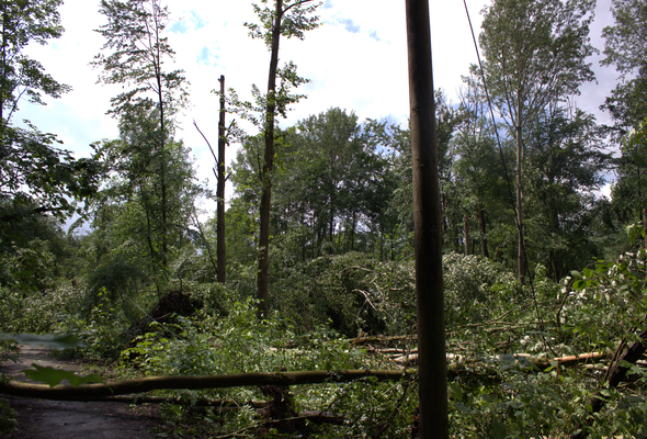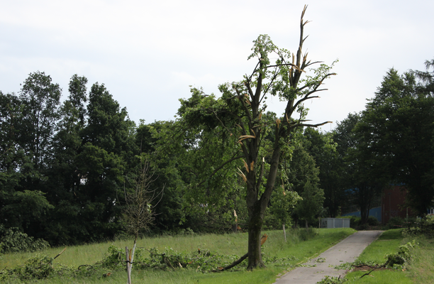 Der Tornado zog anschließend über das Gelände der Realschule Halden (51.368, 7.494) und brachte hier einige Bäume zu Fall und brach teils große Äste ab (s. Bild 26 - TRA, DoD 3: ≥IF1). In der »Feithstraße« (51.369, 7.496) kam es zu deutlich abgegrenzten Vegetationsschäden an einer Baumreihe auf etwa 70 Meter Breite (s. Bild 27). Im darauffolgenden Wohngebiet und an der »Berchumer Straße« wurden hauptsächlich Äste abgeknickt und punktuell Bäume entwurzelt oder abgeknickt (s. Bild 28 - TSA, DoD 1: IF1). Ein Video, aufgenommen in der Straße »Im Alten Holz«, zeigt den Tornado, wie er durch das Wohngebiet zieht (Video - Tornadoliste.de).