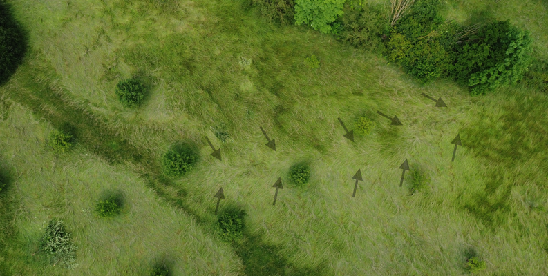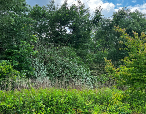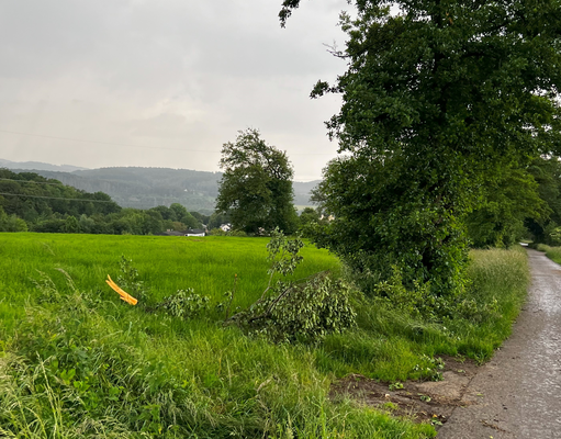 Die Schneise setzt sich mit geringerer Intensität in der »Verband-« und »Florianstraße-« (51.374, 7.544) fort (TRA, DoD 1: IF0.5). An der »Wannebachstraße« (51.375, 7.548) hinterließ der Tornado auf einer Obstwiese eine deutliche Signatur im plattgedrückten Gras, entwurzelte einige Bäume und brach Äste ab (s. Bild 37-38).