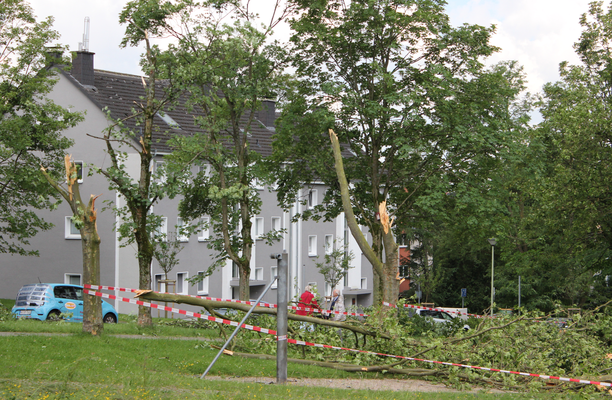 In einer Parkanlage zwischen der »Saarland-« und »Beethovenstraße« (51.366, 7.484) kam es zu erheblichen Vegetationsschäden: Viele Bäume wurden hier entwurzelt oder knickten ab (s. Bild 11-14 - TSA, DoD 2: IF1). Zwei Bäume verloren einen große Teile ihres Baumkronenvolumens (s. Bild 12). In der »Beethovenstraße« beschädigte der Tornado mindestens ein Dach leicht. In der »Hardenbergstraße« (51.366, 7.485) wurde ein Dach und Balkon leicht beschädigt (BNTS, DoD 1: IF1). Die Baumkrone eines gegenüberliegenden Baumes wurde abgeknickt (s. Bild 15) und im weiteren Straßenverlauf ein Straßenschild sowie Äste abgeknickt (s. Bild 16).