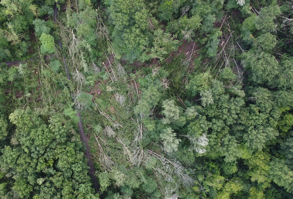 Auswirkungen ziehen sich bis in den Wald Hohenlimburg, wo im weiteren Schneisenverlauf punktuell Bäume umstürzten und Äste abknickten (s. Bild 39 - TSW, DoD 1: IF0.5; Bild 40 - TRA, DoD 1: IF0.5). Im Bereich der »Schälker Landstraße« (51.378, 7.567) verliert sich die Schadensschneise schließlich.