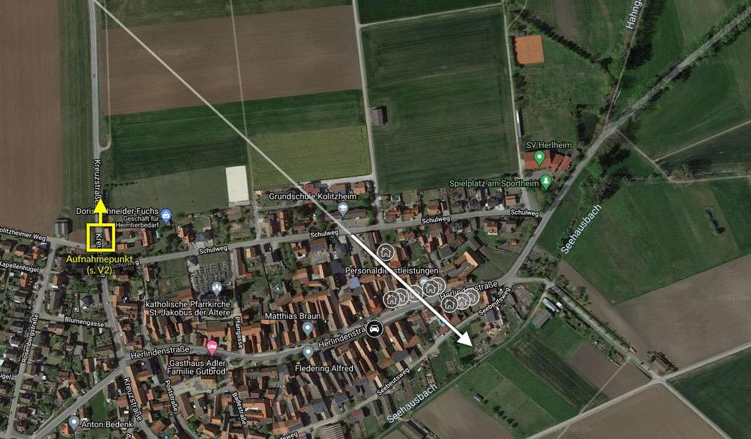 (Video 2: Ausgeprägter Wirbel direkt nordwestlich von Herlheim, rasch in Richtung des betroffenen Bereichs ziehend (s. Übersichtskarte) - YouTube)