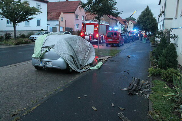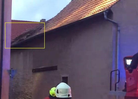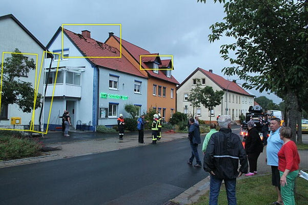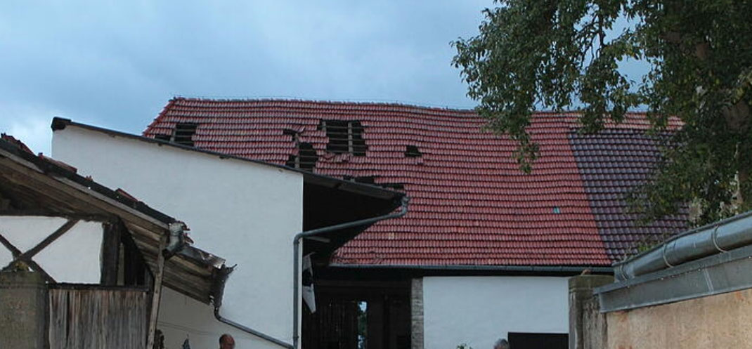 In Herlheim entstand beim Durchzug des markanten Wirbels (s. Video 2) eine rund 90m breite Schneise, in der es zu einigen Sachschäden kam. Südlich des Schulwegs wurde ein Dach teilweise abgedeckt (s. Bild 4).