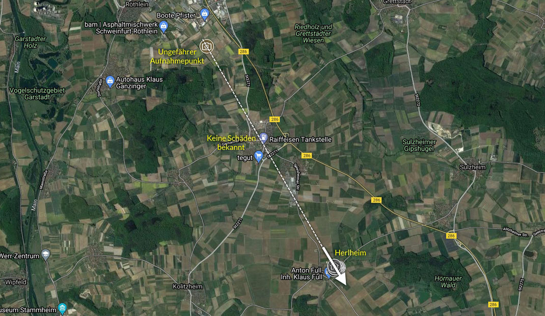 Folgendes Video wurde in Schweinfurt Maintal mit Blickrichtung ~SO aufgenommen und zeigt den Tornado vermutlich grob im Bereich südlich von Schwebheim mit deutlichem Bodenkontakt. Aus dem Bereich zwischen Schwebheim und dem über 6,5 Kilometer südsüdöstlich liegenden Herlheim sind keine Schäden bekannt.
