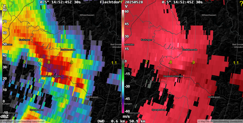 Am 28.05.2025 hatte sich über dem Atlantik ein recht glatte Westströmung eingestellt. Auf der Vorderseite in einer eher diffluenten und leicht zyklonal gekrümmten Höhentrömung. Der zunächst flache Trog konnte sich im Tagesverlauf amplifizieren und zog dabei bis zum Abend westwärts über Deutschland hinweg. Zum dem Höhentrog gehörte ein zunächst flaches Wellentief, dass sich im Laufe des Tages dem Antrieb aus der Höhe folgend ebenfalls intensivieren konnte. Seine Kaltfront kam am Nachmittag von Nordwesten kommend südostwärts bis zur Mitte voran.Im Vorfeld konnten sich in feuchtlabiler Luftmasse einige hundert J/kg bis 1000 J/kg an CAPE entwickeln. Gerade im südlichen Bereich der Labilitätsenergie gab es deutlich erhöhte Scherwerte sowohl hochreichend (0-6 km), als auch im unteren Troposphärenniveau (0-1 km). Die 0-1 km Scherung lag zwischen 10 und 15 m/s und die ebenso erhöhten SRH Werte zeigten das erhöhte Potential für rotierende Zellen und Tornados.