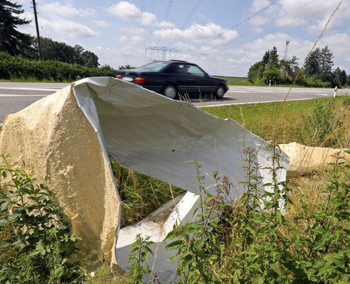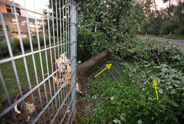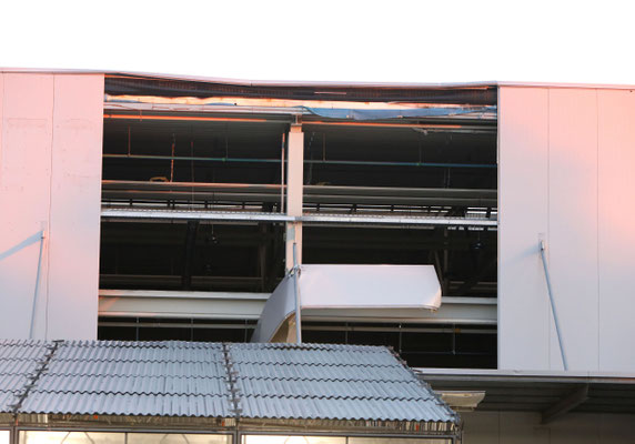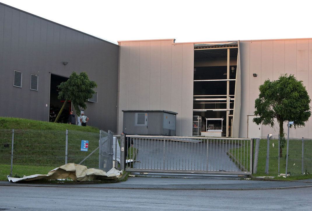 Der Tornado überquerte daraufhin die A4 und überzog das Gewerbegebiet "Im Sachsenring II". Direkt südlich der A4 kam es zu einigen Schäden im Bereich der Straße "Am Sachsenring". Am linken Schneisenrand wurden mindestens zwei Bäume entwurzelt (s. Bild 12). Die Hallenwand einer Lagerhalle wurde herausgerissen (s. Bild 13).