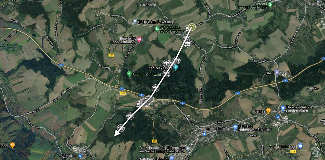 Im Bereich der Limbacher- und Hohensteiner Straße in Falken kam es zu einigen Schäden, die für Feuerwehreinsätze sorgten. Mehrere Bäume wurden entwurzelt, abgeknickt oder anderweitig beschädigt (Bilder - Tornadoliste.de). Im Bereich Pechgraben / Kahnteich südlich von Falken kam es zu weiteren Schäden an Vegetation. Der Tornado überzog darauf den Callenberger Oberwald. Hier wurden auf rund 2,5 Kilometern Länge innerhalb der Tornadoschneise unzählige Bäume abgeknickt und entwurzelt (s. Bild 4-11).