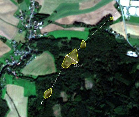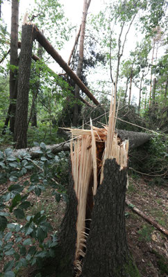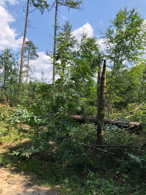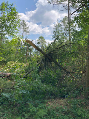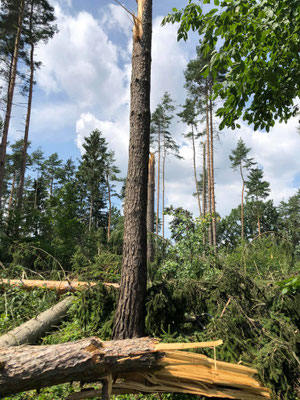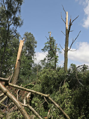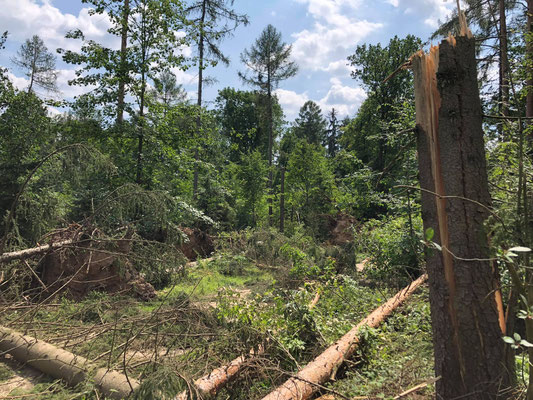 An der darauffolgenden Grenze zum Rüßdorfer Wald kam es zu einigen erhebliche Schäden an Bäumen (s. Bild 18-20). Hier zog der Tornado eine mehrere hundert Meter lange, durchgehende Schneise durch den Wald, in der alle Bäume abgeknickt oder entwurzelt wurden (s. Bild 22-25). Die Schneise ist auch auf Satellitenbildern sehr gut zu erkennen (s. Bild 21). Im Bereich kann die Intensität F2 nicht ausgeschlossen werden.
