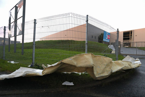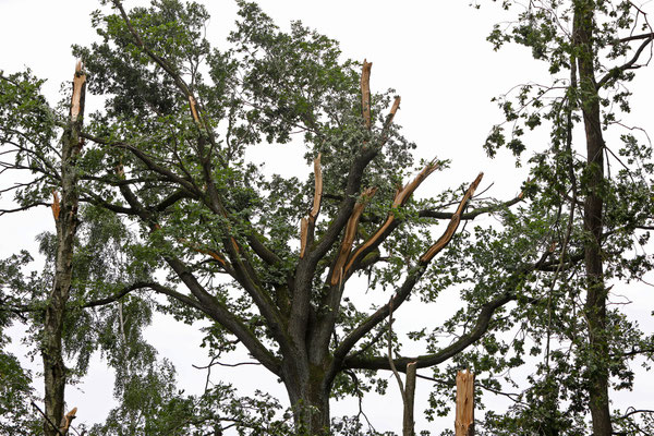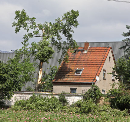 An einer weiteren Fabrikhalle "An der Baumschule" kam es zu Schäden am Dach und der Hallenwand, die zu Teilen abgerissen und verfrachtet wurde (s. Bild 14). Blechteile flogen mindestens 120 Meter weit (s. Bild 15-16). Im Bereich kam es noch zu einigen weiteren Sach- und Vegetationsschäden. Am äußersten rechten Rand der Schneise wurde das Dachfenster und der Kamin eines Wohnhauses leicht beschädigt. Von einem Baum auf dem Grundstück wurden mehrere größere Äste abgebrochen (s. Bild 17).