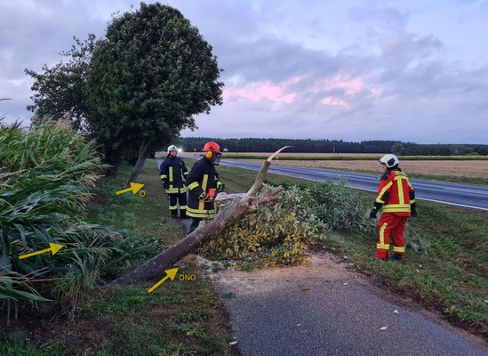 Der Tornado zog daraufhin für einige hundert Meter über freies Feld und erreichte kurz darauf die Gemeinde Karrin, wo es zu einigen Sach- und Vegetationsschäden kam. Am östlichen Ende der Gemeinde wurde ein Dach teilweise abgedeckt und ein großer Baum beschädigt - mehrere große Äste drohten hinabzustürzen und mussten entfernt werden (s. Bild 7).