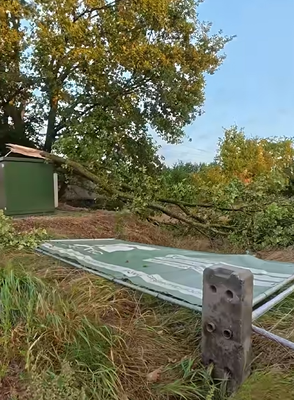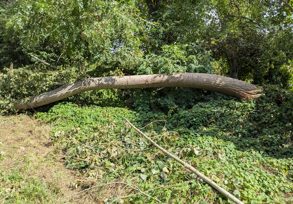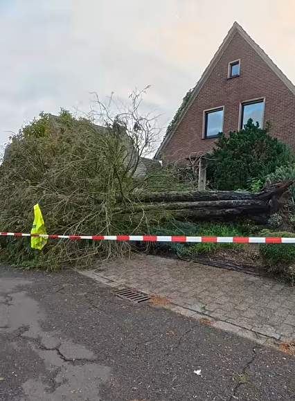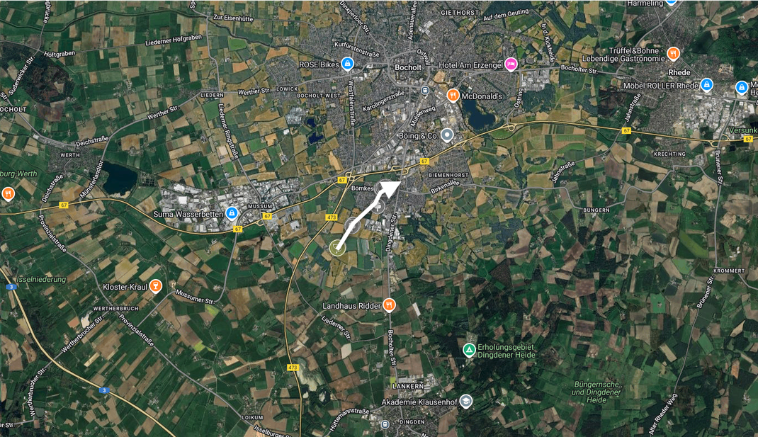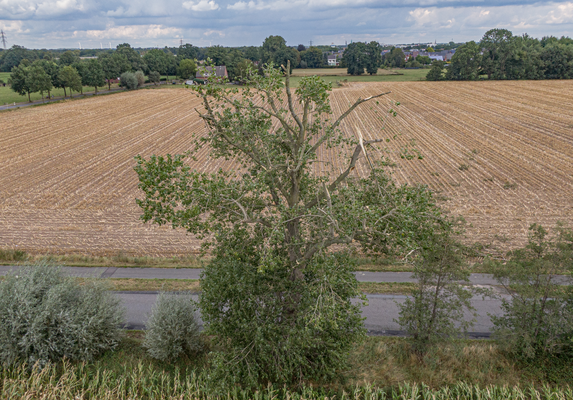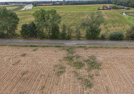 Am Abend kam es im Süden von Bocholt (Ortsteil Mussum) zu auffälligen, punktuell auftretenden Schäden, die sich entlang einer etwa 1.7 Kilometer langen Schneise erstrecken. Am «Loikumer Weg» (51.804, 6.593) wurde eine Pappel am Wurzelansatz abgeknickt und stürzte in nordwestlicher Richtung auf den Weg (s. Bild 1 - TSA/1: IF1). Die Schneise kreuzt anschließend den «Vennweg» (51.808, 6.597), entlang dessen sich eine Baumreihe befindet. Innerhalb dieser Baumreihe verlor ein einzelner Baum zahlreiche, teils große Äste, während die benachbarten Bäume unbeschädigt blieben (s. Bild 2-3 - TRA/2: IF1). Die abgeknickten Äste wurden nordostwärts auf das angrenzende Feld verfrachtet (s. Bild 3).