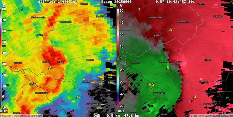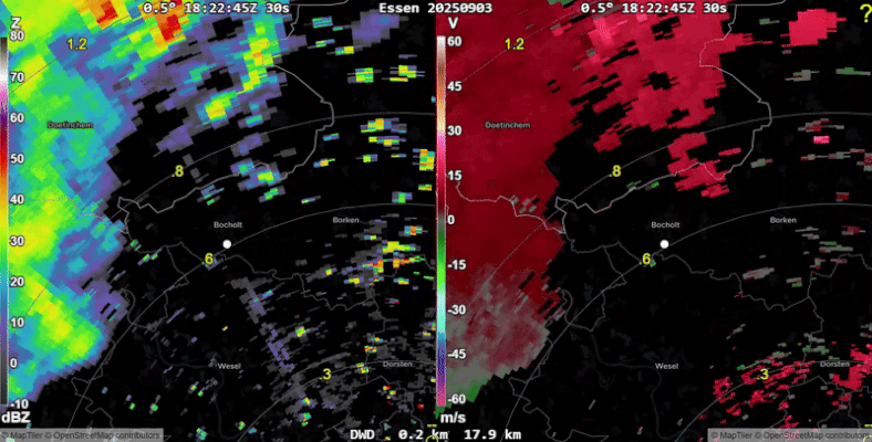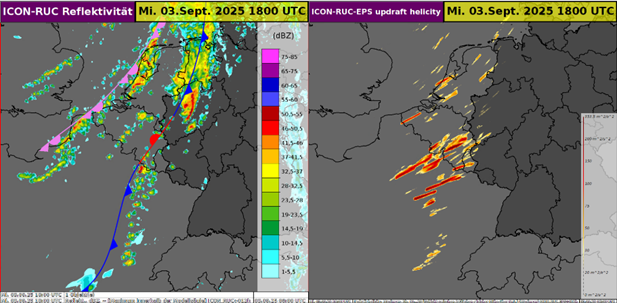 Am 03.09.2025 lag Deutschland auf der Vorderseite eines umfangreichen Trogsystems über Westeuropa. In den Langwellentrog waren mehrere kurzwellige Anteile eingelagert. Ein erster markanter Kurzwellentrog zog dabei am Nachmittag von Ostfrankreich nach Benelux und erreichte in den Abendstunden den Westen Deutschlands. Trogvorderseitig wurden feuchtlabile Luftmasse nach Deutschland verfrachtet. Die Prognosesoundings zeigten eine hochreichend labile Schichtung mit einem niedrigen Hebungskondensationsniveau. Die Prognosehodogrophen des ICON-D2 zeigten zudem eine starke Rechtsdrehung des Windes mit der Höhe, insbesondere in den untersten 500 m, die für die Tornadoentwicklung besonders wichtig sind. Einziges Manko war die späte Tageszeit und die Möglichkeit, dass die Grundschicht schon etwas stabilisiert haben könnte. Die Organisation entlang einer wellenden Kaltfront, konnte dieses Manko etwas beheben. Die Updraft Helicity tracks zeigten deutliche Hinweise für das Potential von rotierenden Zellen.