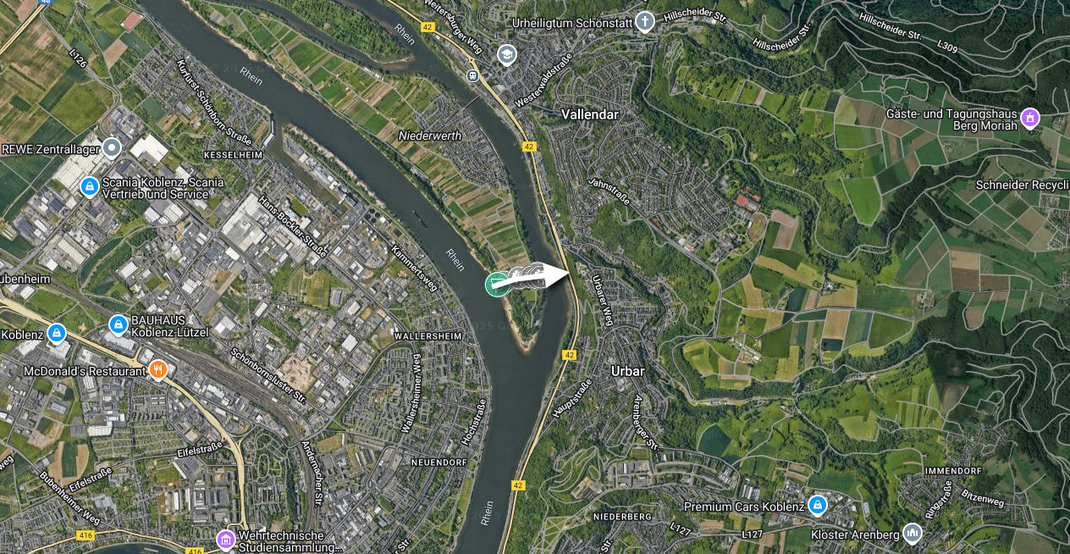 Nachdem der Tornado das Vereinsgelände überquert hatte, kam es am östlichen Rheinufer in einem kleinen Waldgebiet (50.386, 7.616) zu weiteren klar abgegrenzten Schäden. In einem rund 35 Meter breiten Bereich brachen zahlreiche Äste und ein Zwiesel (s. Bild 8; TSA, DoD 0: IF0.5). Direkt am Flussufer stürzten zwei Pappeln in ostnordöstliche Richtung (s. Bild 9; TRW, DoD 3: IF0.5). Dabei handelt es sich um die letzten gesicherten Auswirkungen, die dem Tornado zugeordnet werden können.