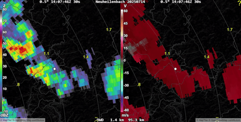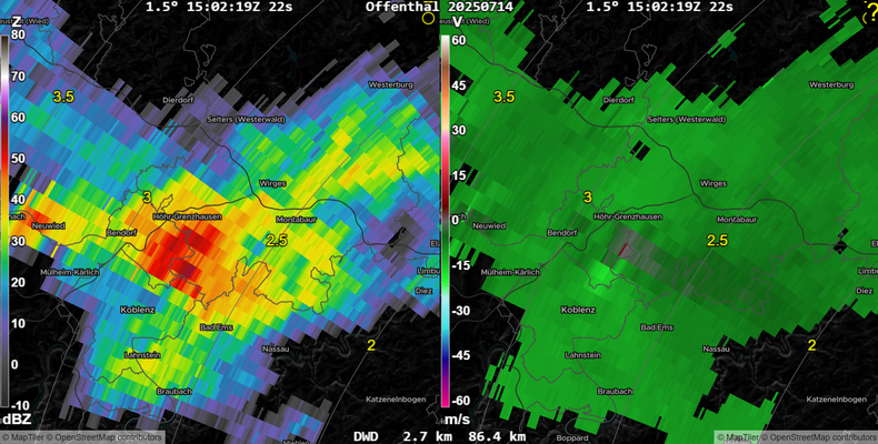 Am 14.07.2025 lag Deutschland an der Südflanke eine Tiefdruckrinne, die sich von den Britischen Inseln über Nord- und Ostsee bis nach Weißrussland erstreckte. In die südlich daran anschließende Frontalzone waren mehrere Kurzwellentröge eingelagert, die von West nach Ost gesteuert wurden. Einer dieser Kurzwellentröge überquerte die Südhälfte von Deutschland. Im Vorfeld konnten sich in der feuchtlabilen Luftmasse CAPE Werte von teils mehr 1000 J/kg entwickeln. Die hochreichende Windscherung war eher schwach, sodass in der feuchten Luftmasse vor allem der Starkregen im Fokus stand. Damit handelte es sich nicht um eine klassische Gewitterlage. Es zogen schließlich wiederholt mehrere Zellkomplexe über Deutschland von West nach Ost. Dabei ergaben sich aufgrund der Eigendynamik durchaus strömungsunabhängige Zugbahnen. Im Interaktionsbereich bei Koblenz ergab sich dann kurzzeitig ein Bereich mit erhöhter Rotation. Klassischer Fall von mesoscale accident.