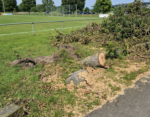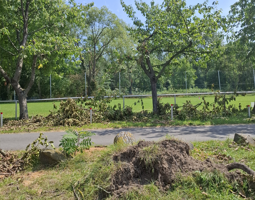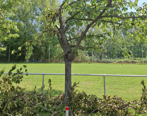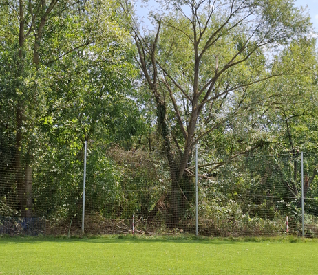 Der Tornado überquerte daraufhin den Skatepark (50.386, 7.614), wo es zu geringfügigen, aber abgegrenzten Vegetationsschäden kam. Im weiteren Verlauf wurde die Zufahrtsstraße zum Vereinsgelände des SV Niederwerth gequert (50.386, 7.616). In einem etwa 25 Meter breiten Bereich kam es dort zu (teil-)entwurzelten Walnussbäumen und zahlreichen Astabbrüchen (s. Bild 5-7; bis TRW, DoD 3: IF0.5).