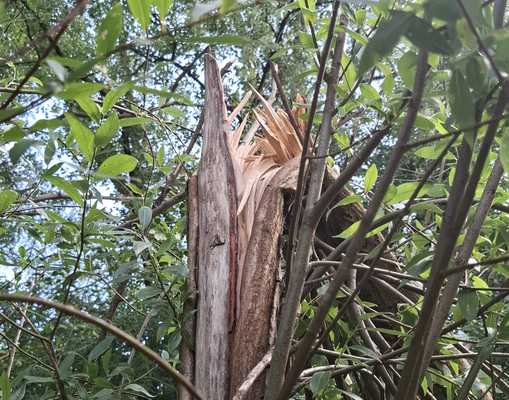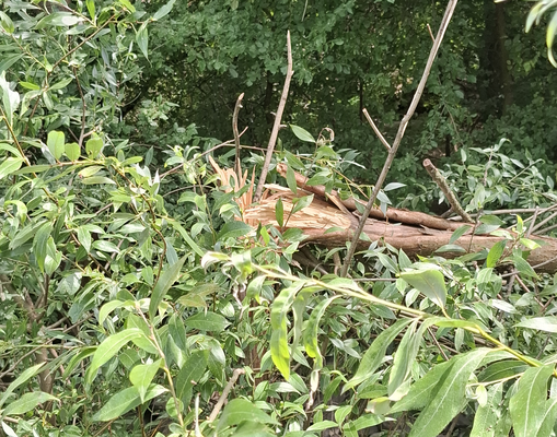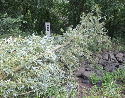 Die ersten bekannten Auswirkungen entstanden im Bereich des «Strandzugangs Niederwerth» (50.386, 7.612), wo im Uferbereich innerhalb eines etwa zehn Meter breiten Bereichs unter anderem zwei Silberweiden in südöstliche Richtung abgeknickt wurden (s. Bild 1-3; TSW, DoD 1: IF0.5). Im darauffolgenden Waldgebiet wurde mindestens ein großer Ast abgebrochen (s. Bild 4; TSA, DoD 0: IF0.5).