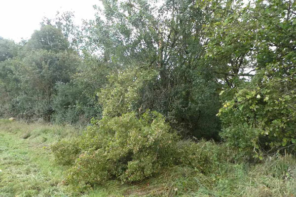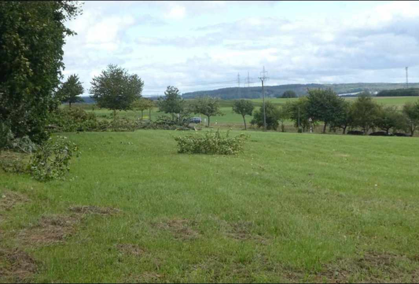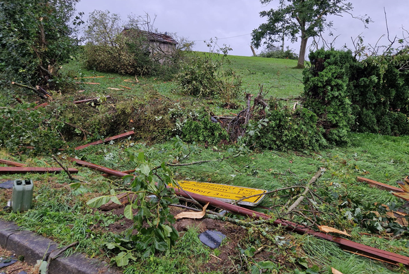 Der Tornado schwächte sich nordöstlich von Nusbaum deutlich ab. Auf einem Hügel südwestlich von Halsdorf (49.928, 6.368) kam es zu einigen leichteren Schäden an Vegetation (s. Bild 15 - TRA, DoD 1: IF0.5) und an einem mobilen Hochsitz, der umstürzte (s. Bild 16). Ein mittelgroßer Ast wurde weit entfernt von Bäumen auf einer Wiese abgelegt (s. Bild 17).