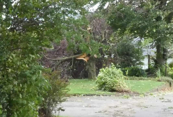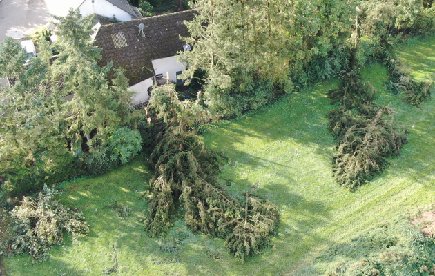 Im Bereich »Brunnenstraße« / L3 (49.920, 6.340) deckte der Tornado ein Dach samt Dachstuhl nahezu komplett ab (BRD, DoD 2: IF2) und verfrachtete Dachteile bis zu über 100 Meter weit (s. Bild 9-10). Viele der umliegenden Bäume wurden abgeknickt oder verloren große Teile ihre Baumkronen.