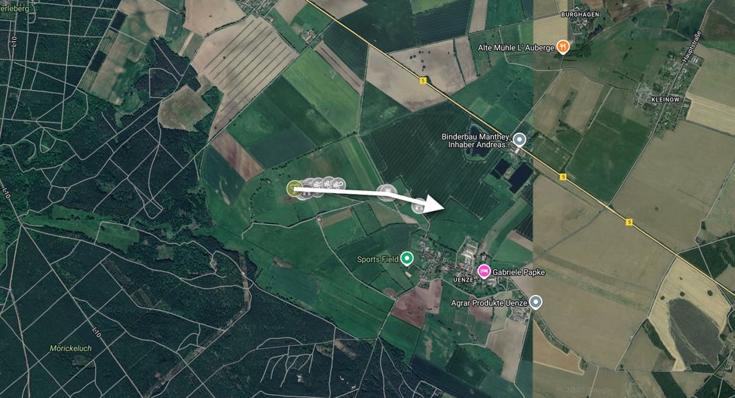 Auch in der darauffolgenden kreuzenden Straße (53.041, 11.918) kam es laut Gemeinde zu Schäden an einem Wohnhaus. Über das genaue Schadensausmaß ist nichts bekannt. Insgesamt ergibt sich nordwestlich von Uenze somit eine etwa 1,3 Kilometer lange Schneise. Entlang dieser Schneise kam es an allen kreuzenden Straßen abgegrenzt zu Schäden. Besonders im vorderen Abschnitt lassen sich rechtwinklige Wirkungsrichtungen sowie weitreichende Verfrachtungen von Trümmern beobachten.