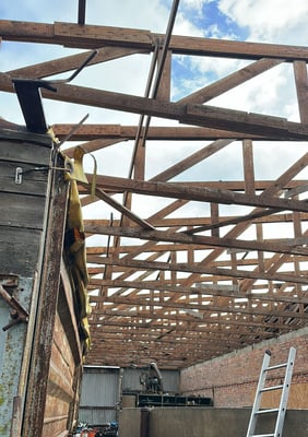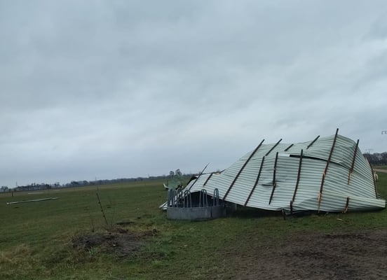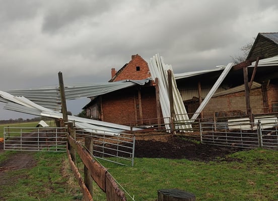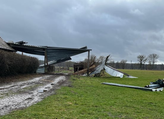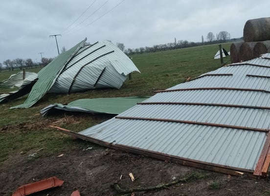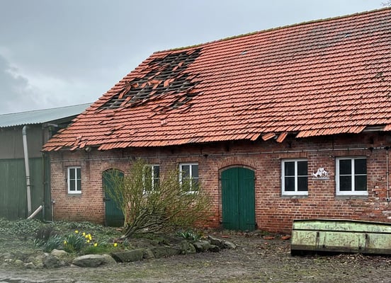 Am Mittag des 30.03.2025 kam es in Uenze, südöstlich von Perleberg, im Zusammenhang mit einem durchziehenden Gewitter lokal zu Sach- und Vegetationsschäden. Zunächst kam es auf einem Hofgelände in Uenze-«Ausbau» (53.04, 11.901) zu Schäden an mehreren Gebäuden. Mindestens drei Dächer wurden abgedeckt. Ein Ziegeldach teilweise (s. Bild 1 - BNTS, DoD 1: IF1), zwei Blechdächer vollständig (s. Bild 2-4 - BNSW, DoD 3: ≥IF1). Ein Strauch wurde in nordnordwestlicher Richtung teilentwurzelt – rechtwinklig zum Verlauf der Schneise (s. Bild 1) – und von mehreren Bäumen brachen Äste ab (TRA, DoD 1: IF0.5).