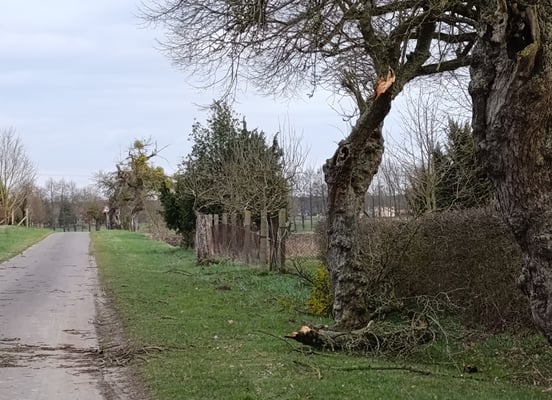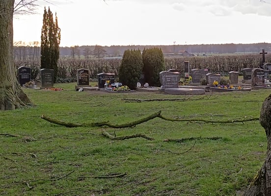 Es folgen etwa 600 Meter ohne bekannte Auswirkungen (Felder), bevor auf selber Höhe an der nächsten kreuzenden Straße (53.042, 11.914) erneut Schäden in einem eng begrenzten Bereich entstanden. Hier traf es den örtlichen Friedhof, auf dessen Gelände zahlreiche Äste von Bäumen abbrachen (s. Bild 8-10 - bis TRA, DoD 1: IF0.5). Ein Geräteständer wurde angehoben und landete am Rand des Friedhofes auf dem Dach (s. Bild 11 - OFH, DoD 1: IF0.5).