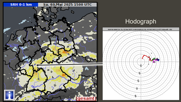 Am 03.05.2025 lag Deutschland in einer westlichen Höhenströmung. Dabei wurden die nördlichen Landesteile von einem Höhentrog über Nordeuropa mit eher kühlen Luftmassen beeinflusst. Der Süden lag hingegen im Bereich feuchtwarmer Luftmassen. Im Grenzbereich konnte sich eine Luftmassengrenze ausbilden, entlang derer sich eine zonal orientierte Bodentiefdruckrinnen von West nach Ost erstreckte. Im Bereich der Tiefdruckrinne konnten erhöhte Feuchtwerte mit Labilität überlappen, sodass sich wenige hundert J/kg an MLCAPE entwickelten. Die Windscherung zeigt im Bereich der Luftmassengrenze erhöhte Scherwerte zwischen 15 und 20 m/s zwischen 0 und 6 km. Aber auch im unteren Troposphärenbereich (0 bis 1 km) waren die Scherwerte mit Werten teils über 10 m/s solide. Prognosesoundings zeigten im Bereich bis 1 km eine schöne Krümmung und damit erhöhte SRH Werte. Folglich entwickelten sich einige länger lebende und rotierende Superzellen. Neben größerem Hagel und schweren Windböen, führten diese auch zu insgesamt mindesten drei Tornados über der Mitte des Landes.